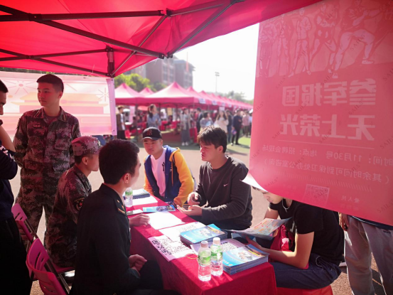 蓝永金副校长、副书记,武装部黄志刚部长,罗立和副部长莅临现场指导征兵宣传工作,武装部工作人员和退伍复学学生代表等为前来咨询的同学派发宣传资料、提供咨询服务。