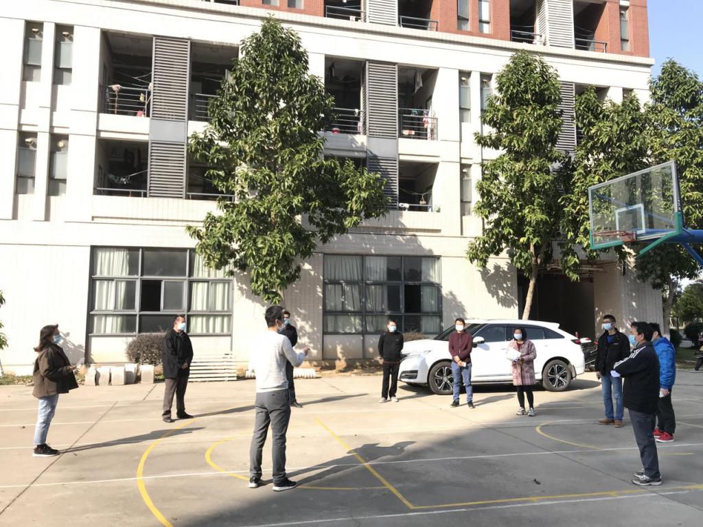 总务处处长谢凯忠(左三)组织后勤队伍相关负责人进行卫生消毒工作培训