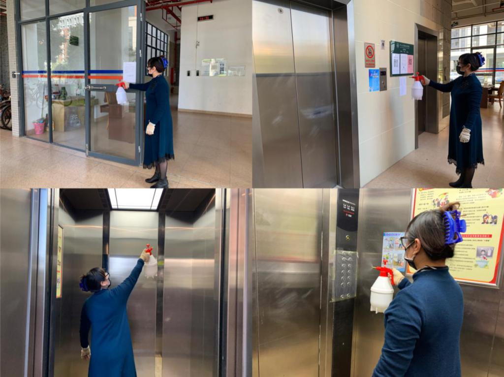 教师公寓管理员对大堂和电梯进行消毒,并在电梯门口登记消毒记录