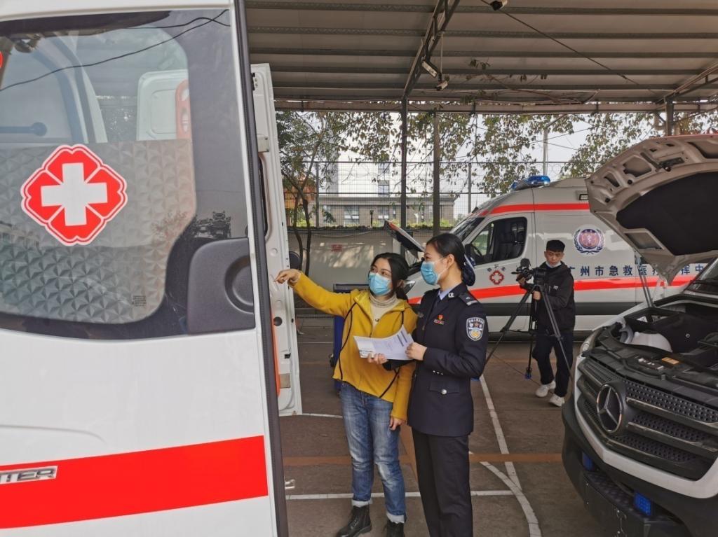 刘洋(左一)在东漖车管所办理救护车上牌业务,向车管所工作人员介绍救护车相关情况