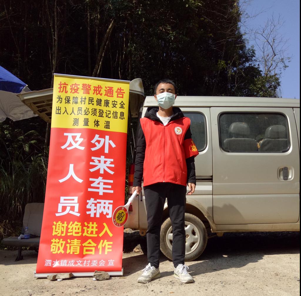 人民子弟兵永远是保卫祖国的钢铁长城,永远是守护家园的忠诚卫士。2017级电子商务专业的李城同学,不仅是一名大三学子,更是一名光荣的退伍军人。庚子鼠年春节之际,疫情来势汹汹。在他的老家,平远县泗水镇成文村,村委干部每天都在村口设卡值守,风雨无阻。恰逢寒潮来临,值守十分不易。李城同学积极响应退伍军人事务局的号召,做到“若有战,召必回”,主动找村委干部报名,参加村口设卡,测量来往车辆人员体温,并登记在册,确保来往人员安全,保卫家乡平安。