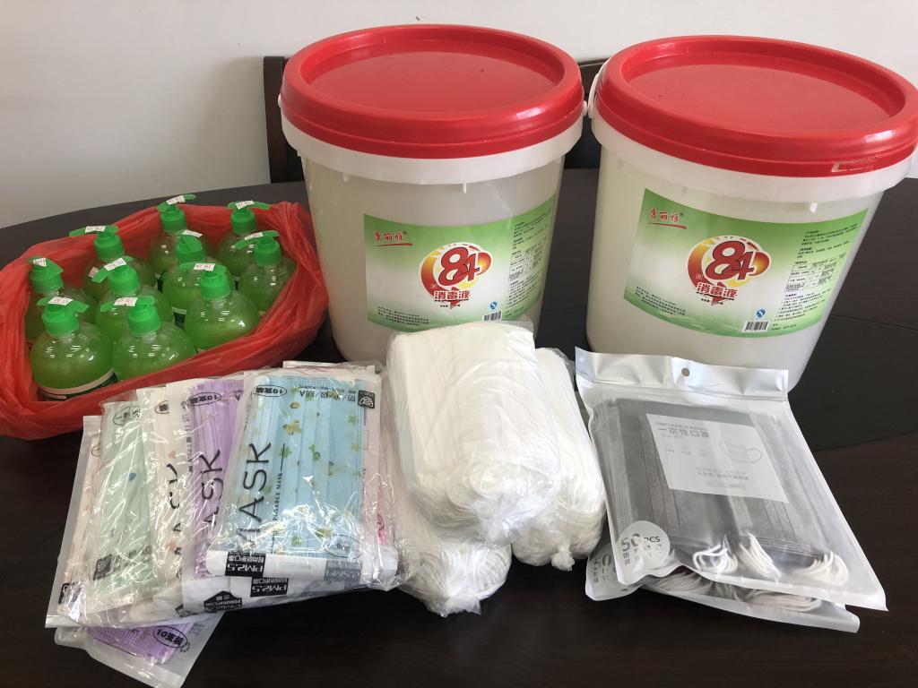 精格直饮水公司罗秀容女士捐赠的84消毒液两桶40L、洗手液10瓶、一次性口罩500个