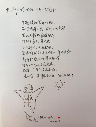 你们是白衣天使,你们是白衣战士,你们都是英雄。在最艰难的时刻,你们用自己的行动践行了天使的誓言,你们是“最美的逆行者”,你们用医魂、大爱、温度、奉献诠释着“医者仁心”。看着你们的战“疫”日记,我的心很暖,很欣慰,也很感动,你们用自己的毅力战胜了一切的困难,你们用自己温暖的双手温暖的不仅是患者的心,中国人民的心,而是温暖着这个世界,好样的!但是,我同时也很心痛,都是父母的孩子,老师心里的孩子呀!老师们的心中时刻都在牵挂。孩子们,照顾好自己,盼着你们早日平安归来,再回来中大新华这个家聚聚,孩子们,加油!