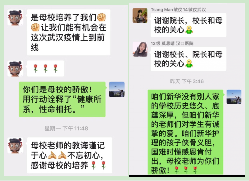 除提供生活上的物质帮扶,为了缓解一线援鄂校友们每天高强度工作所带来的心理压力,王秀岚执行院长组建了“中大新华驰援武汉抗疫校友群”,每天通过微信群给校友们打气加油,传递母校师生的关爱,给他们带去满满的正能量。
