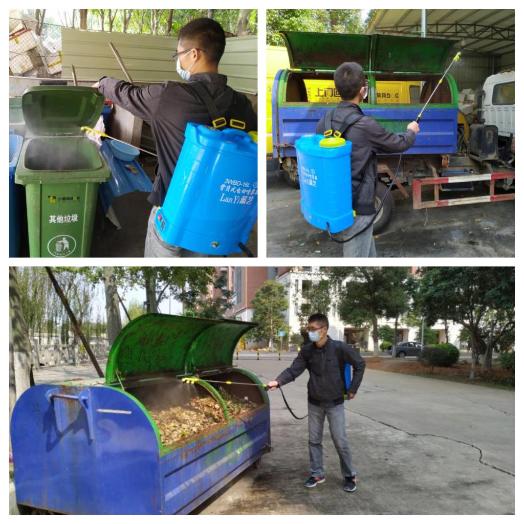 清理过后,党员同志们背上“水桶”,拿起“喷枪”,对公共卫生间、垃圾收集箱、公共垃圾桶、垃圾压缩站等关键区域实施全方位无死角喷洒消毒,努力创造安全卫生的校园环境,实实在在为师生生命安全和身体健康保驾护航。