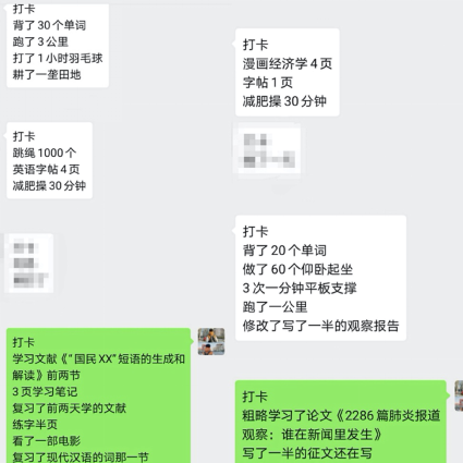战“疫”期间,为了能够监督自己坚持每天学习,我和朋友约定,每天晚上在微信群进行打卡。打卡的内容不局限于学校规定的课程内容,也可以是阅读文章或者学习的感想。