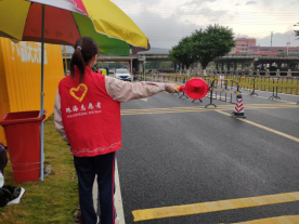陈秋月同学正在引导进入城区车辆,示意靠边检测