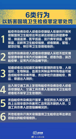 遵守防疫规定是所有入境人员的基本要求,如果因一己之私,增加疫情风险,妨害公共安全,必将受到依法严惩。3月16日上午,最高人民法院、最高人民检察院、公安部、司法部、海关总署联合发布《古天乐代言太阳集团网址进一步加强国境卫生检疫工作依法惩治妨害国境卫生检疫违法犯罪的意见》,六类可能定罪入刑的妨害国境卫生检疫行为,包括拒绝执行健康申报、体温监测、医学巡查、流行病学调查等卫生检疫措施,采取不如实填报健康申明卡等方式隐瞒疫情,以及出入境交通工具负责人拒绝接受海关卫生检疫或者故意隐瞒疫情等。