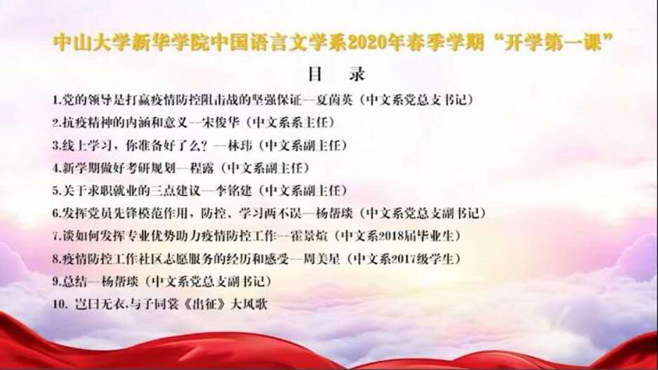 3月15日下午,中山大学新华学院中国语言文学系(以下简称“中文系”)在超星泛雅学习平台上开展“开学第一课”。此次课程上,中文系领导亲切慰问了同学们的学习和日常生活状况,并对在线学习提出了要求。疫情无情,人有情。面对这场没有硝烟的战“疫”,中文系师生团结一心,共克时艰。