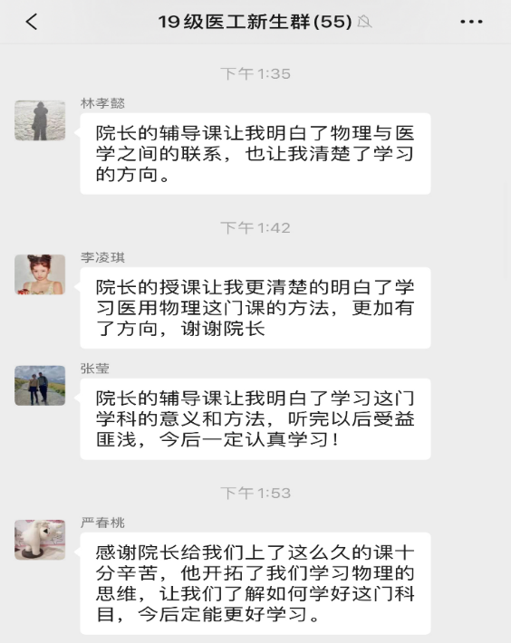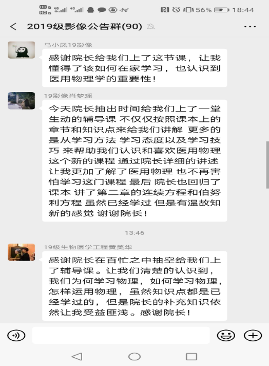 19医工陈瑜强:在听院长的辅导课中,我发现自己学习医用物理学方法并不是很好,我会牢记院长给我们讲的方法并运用到学习中。感谢院长,院长辛苦了。