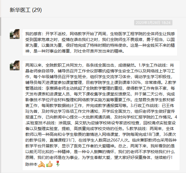 为落实好学校制定的疫情期间在线教学实施方案,实现“开学不返校,教师不停教,学生不停学,管理求实效”,生物医学工程学院院长陈仲本教授带领学院全体教职工积极部署,统筹推进,召开系列在线工作会议,布置工作任务,精心组织在线经验交流,做好教职工动员与教学准备、培训工作。陈仲本教授以科学严谨的精神、勇往直前的态度,善待学生,关心教师,率先示范,尽职尽责,及时转变教学方式,主动熟悉网络教学平台,出色完成特殊时期的教学任务。