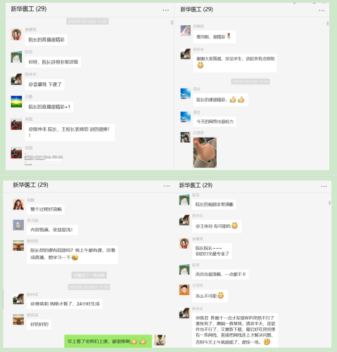 由于使用QQ群上传视频或者下载视频需要很长时间,时效性不好,很有可能影响到正常的教学进程。同时,在QQ群建立之后,同学们纷纷表示非常想念学校的老师和同学们,希望能尽量重现课堂教学的感觉。于是,在与老师们的交流后,陈仲本决定尝试使用腾讯课堂进行直播,一方面可以与学生拉进距离,让学生觉得有亲切感;另一方面,经测试后,腾讯课堂效果不错,且具有回放功能,直播过程中也可与学生进行实时互动。通过不断地测试,陈仲本开心地在工作群里与老师们分享:“终于在腾讯课堂跟学生对接上了,学生看到我挺高兴的。腾讯课堂不错,直播效果好,还可以设置回放,又一个上课工具。特殊时期,也逼着自己学了不少东西,还是很有收获的。”