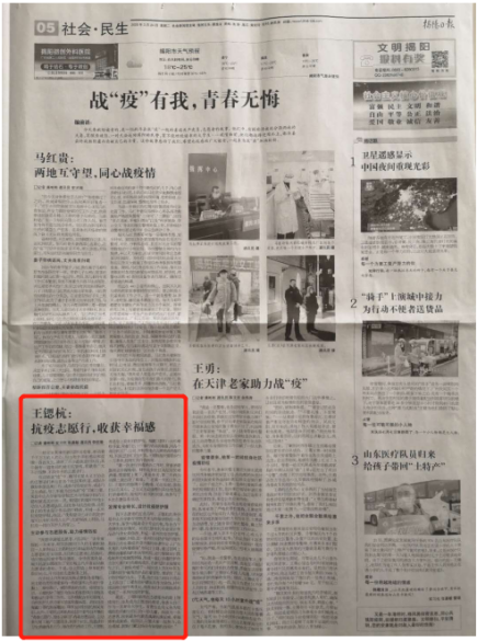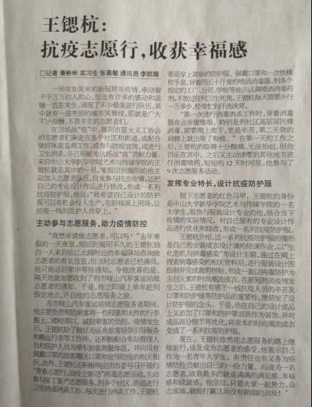 随后,《揭阳日报》记者潘彬彬对王锶杭进行了专题采访。他的志愿事迹登上了揭阳日报,向广大读者群众传递正能量,树立为一个有责任、有担当、热爱家乡的新时代青年典型。