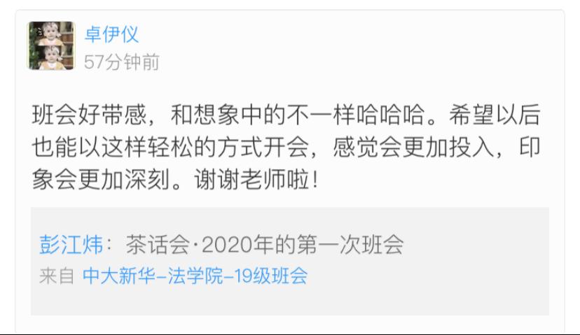 草长莺飞,春暖花开的四月本是学习的好时节,但受疫情的影响,今年的学习方式发生了很大的变化。4月4日,法学院19级师生借助网络线上召开了2020年春季学期第一次班会。此次班会由法学院19级辅导员彭江炜老师主持,以“自律才能自强”为主题,旨在号召全体学生提高学习自律性,建设良好的学习风气。