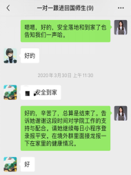 为更好地完成计划回国的师生做好行程上报及跟进工作,外院组建“境外学生紧急联系群”“一对一联系群”等微信群,由专人一对一跟进计划回国师生的身体状况和心理情况,并及时将由中国政府有关部门、中国驻外大使馆发布的相关资讯转发给师生,叮嘱他们做好返程的防护准备。师生回国后,隔离期间的健康状况由专人每日上报给学校防控办、学生处、外事处、人事处和保卫处,时刻关心关怀他们的健康安全。