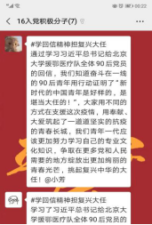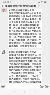 5月1日,健康学院开展主题为“学回信精神担复兴大任”点亮青春云班会,开展以【点亮青春】云班会→师生联合党支部云学习→年级班群大讨论→共青团员大实践为路径的“击鼓传花”式深入学习活动,“同学习、齐分享、共实践”,形成了学习习近平总书记重要回信精神的浓厚氛围。