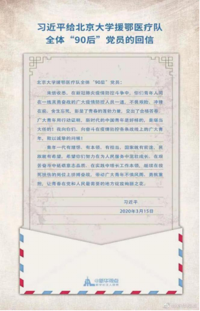 近日,习近平总书记给北京大学援鄂医疗队全体“90后”党员回信,“广大青年用行动证明,新时代的中国青年是好样的,是堪当大任的”。习近平总书记向奋斗在疫情防控各条战线上的广大青年致以诚挚的问候,希望他们努力在为人民服务中茁壮成长、在艰苦奋斗中砥砺意志品质、在实践中增长工作本领,继续在救死扶伤的岗位上拼搏奋战,带动广大青年不惧风雨、勇挑重担,让青春在党和人民最需要的地方绽放绚丽之花。