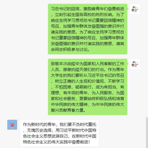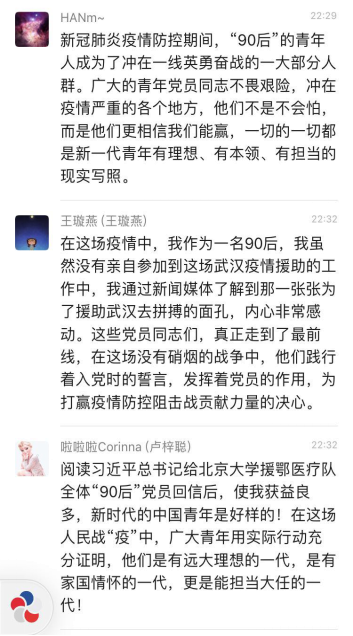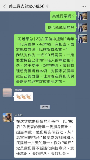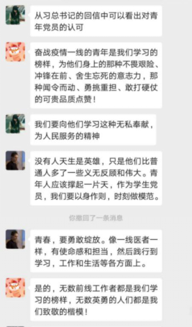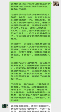 通过这次讨论,我受益非浅。自己也同样是一名“90后”的党员,我虽然没有上战场发挥自己的价值,但是我也做好自己身边能做对的每一件小事。不断地做好身边人的工作,不断传输给他们正确的防范做法,出门带好口罩,勤洗手,少出门。配合安检人员的检查,为疫情防控尽自己的绵薄之力。当家人看的中英文结合报道,出现翻译错误时,我告诉家人,那是错误的消息,不要跟风转发朋友圈微信群,不信谣不传谣。青年一代的我们,有理想、有本领、有担当,我们也会努力在为人民服务,在实践中增长工作本领,让青春在党和人民最需要的地方绽放绚丽之花。