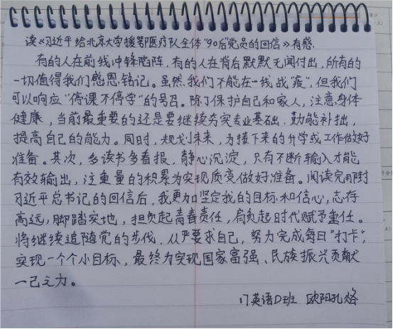 “让青春在党和人民最需要的地方绽放绚丽之花”这是习近平总书记对北京大学援鄂医疗队全体“90后”的赞美,也是对我们这批新中国青年的期望和要求。我深刻地明白,我并不是什么特殊的天才,亦没能在什么公共事业岗位中为国家奋斗,我就是万千青年党员中普普通通的一个。我知道,我可以不起眼,但我不能自暴自弃。我明白,摩天大厦也是从一砖一瓦建起来的,我做不到大厦的logo,也可以做底层的砖块。我没有能力实地援鄂,但我能在捐款上奉献一份力量;我没有办法为医护人员们提供帮忙,但是我可以响应国家的号召,和家人固守在家,不为他人添麻烦;战场不单止前线,后方也是我们战斗的地方!
