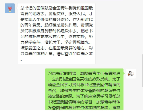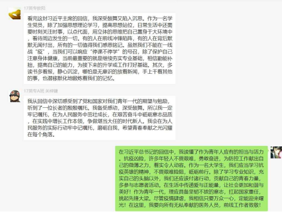 4月29日、5月3日,外国语学院学生第一、第二党支部分别组织开展了“贯彻学习习近平总书记回信精神”主题党日活动,支部党员同志们通过线上平台研读总书记的回信,学习回信精神,分享心得与感悟。