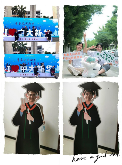 16级信息资源管理专业赖舒婷表示,“岁月匆匆,转瞬四年,留下许多美好的回忆。从陌生到熟悉,收获了珍贵的友谊;从青涩到成熟,收获了难忘的经历。大学四年将成为我一生中最宝贵的财富。由于疫情影响,这次毕业非常特殊,没能看到所有想见的人,没能和他们在学校拍照留念,没能来一次毕业旅行,心中不免有一些难舍。希望大家毕业以后前程似锦,健健康康开心快乐,在各自的工作领域发光发亮。”