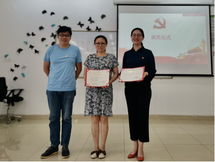 李莹(左)为三等奖获奖者冒娟(中)、王慧春(右)颁奖