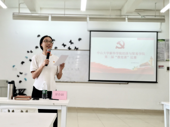 为进一步深入学习宣传贯彻习近平新时代中国特色社会主义思想,全面提高基层党组织理论水平,夯实“不忘初心、牢记使命”主题教育成效,6月4日上午,经济与贸易学院(以下简称‘经贸学院’)在东莞校区格物楼②B501举办第二届“微党课”比赛,比赛邀请管理学院党总支副书记廖诗颖、经贸学院党总支副书记李海峰、经贸学院教工第三党支部组织委员李莹担任评委,由经贸学院教工第三党支部书记李丹琳担任主持。