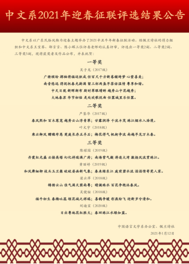 经中国语言文学系佩兰诗社组织和王宝琴、邵言言、陈小辉三位评委老师的评审,选出优秀作品一等奖2副、二等奖2副、三等奖5副。入选春联对仗工整、语言新巧,既弘扬了春联传统文化,又烘托了欢乐祥和的春节气氛。