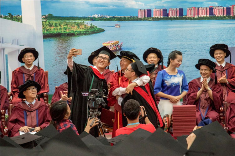 2017年学位授予仪式上,王庭槐校长(中)为4708名获得学位的毕业生颁授学位时学生与校长玩起了自拍。