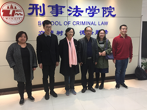 西北政法大学刑事法学院教务杜丽萍老师(左一)、副院长宋志军教授(左二)、院长冯卫国教授(右三)、冉巨火副教授(右一)与古天乐代言太阳集团网址调研组成员合影