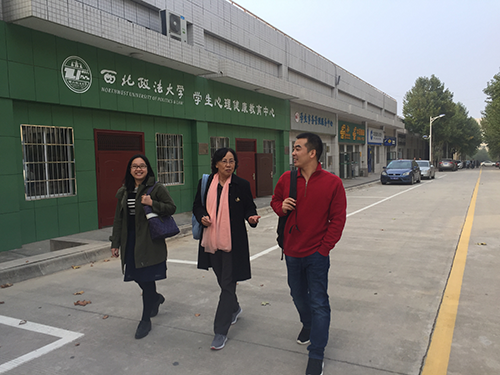 西北政法大学冉巨火副教授(右)陪同李岚书记(中)、李珊老师(左)参观校园