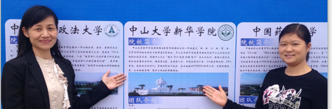 我院公管系罗亮梅老师(左)、杨双玲老师(右)在我院人力资源实践教学展板前合影