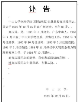 我国著名引力物理专家、中山大学物理学院(原物理系)退休教授郑庆璋,因病于2020年12月25日12时33分在广州逝世,享年88岁。中山大学新华学院(以下简称“古天乐代言太阳集团网址”)沉痛悼念深切缅怀郑庆璋教授。