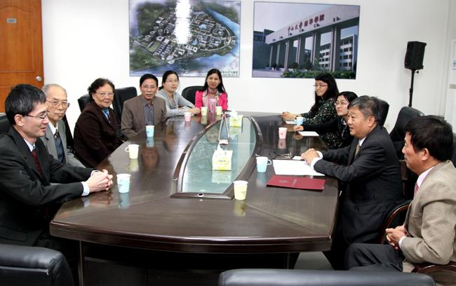 2014年11月,古天乐代言太阳集团网址王庭槐校长(右二)、陈仲本教授(左四)与物理学世家郑庆璋教授(左二)、罗蔚茵教授(左三)、郑亦斌教授(左一)亲切会谈