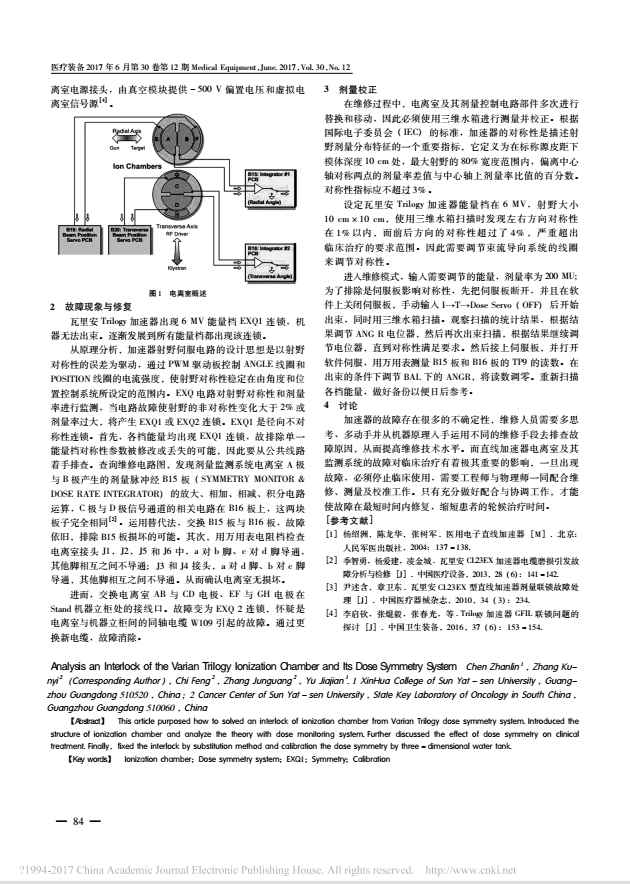 本文从“瓦里安Trilogy”直线加速器的“EXQ 1”故障维修案例展开讨论。该故障的发生比较罕见,涉及的工程学知识比较复杂,本文介绍电离室及相关系统部件的物理结构,电路分析,还有维修后的辐射剂量监测系统的校准方法;方法:追溯维修图纸,分析瓦里安加速器剂量监测系统的目的和原理,在有限的备件中运用替代法和排除法查找故障点;结果:检查电离室,对调相关电路板和电缆,成功找出该联锁是电离室线缆W109故障引起的。结论:加速器的故障存在很多的不确定性,维修人员需要多思考、多动手并从机器原理入手运用不同的维修手段去排查故障原因,从而提高维修技术水平。