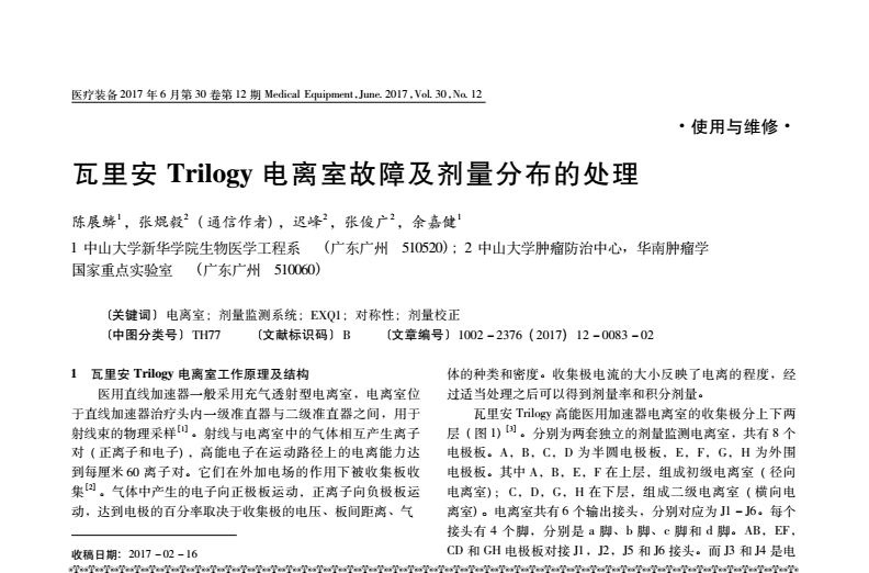几位师长的悉心点拨和大力支持,让陈展鳞备受鼓舞。他结合师长们的意见,认真思考,细心修改,在原文的基础上增加了相关数据和图表以增加说服力,减少器械维修的叙述,增大医学物理原理的篇幅,提升文章高度,并把论文语言书面化、精简化。几经修改后,陈展鳞才将他的文章投了出去。后来他的这篇文章《瓦里安Trilogy电离室故障及剂量分布的处理》被《医疗装备》杂志收录,并在毕业前几天发表了,这样的时刻,让陈展鳞觉得颇有纪念价值。
