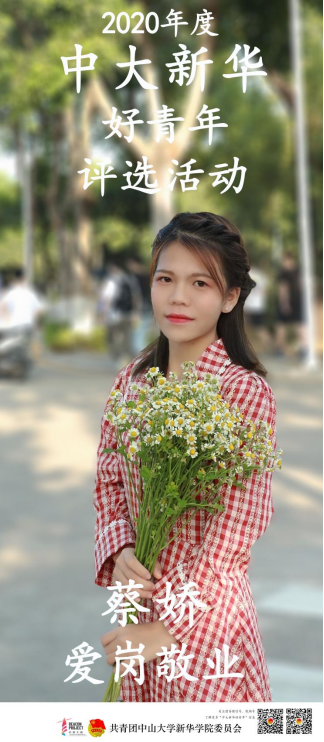 蔡娇,共青团员,中国语言文学系2017级汉语言文学专业学生。曾任系团委干部,志愿队队长、社会实践队队长等职务,现任校团委学生副书记。大学四年从一名志愿者到系团委委员再到校团委学生副书记,这每一步都是她自己努力的结果。她在实践中甘于奉献,由志愿服务延伸至社会实践,在坚守初心使命的同时积累经验,走向更广阔的平台。