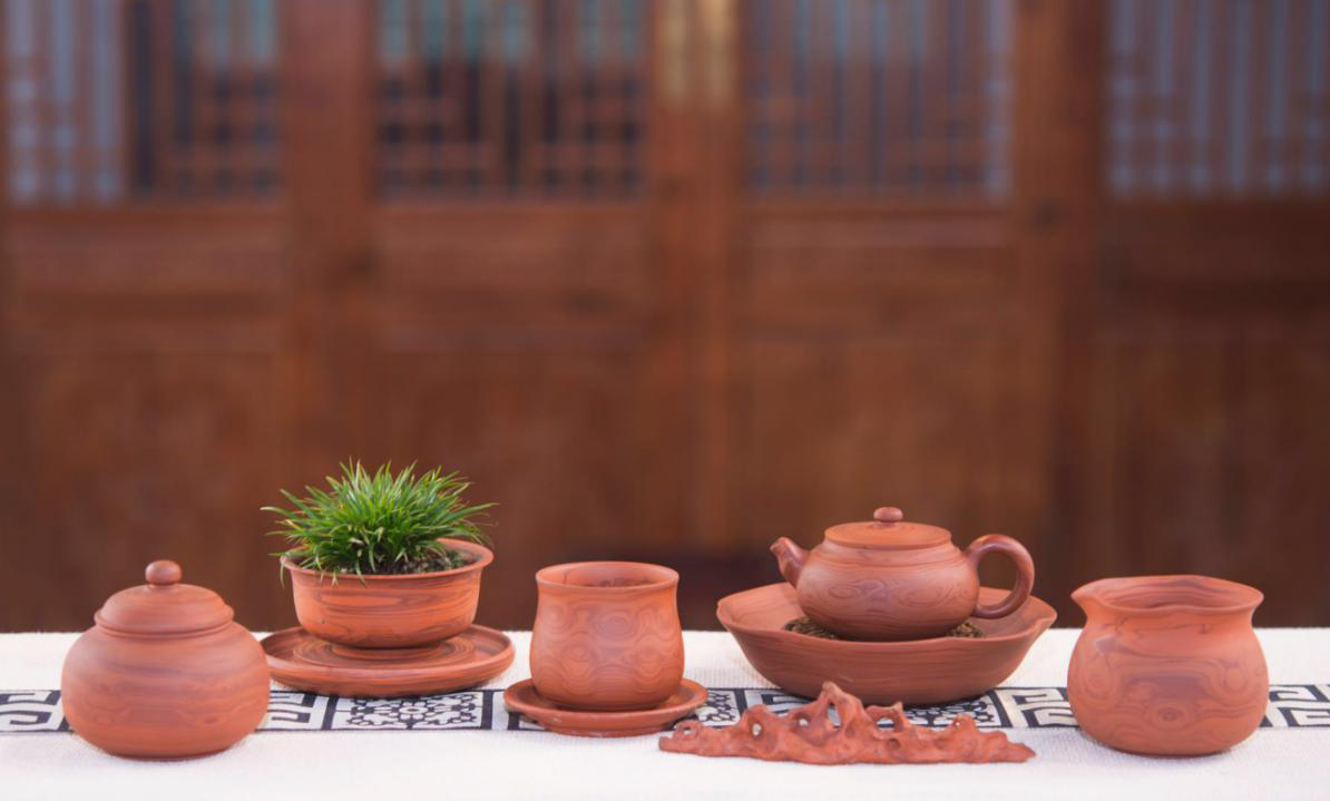 回到潮州后,张泽锋以纯天然紫砂作为原料,模仿黄花梨的独特质地,配以“小鬼脸”纹理,经过了近一年的反复试验、设计,终于创作出一套《海黄之韵系列》的紫砂壶作品。