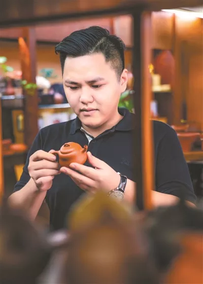张泽锋是裕德堂第五代传人,他的父亲,便是中国工美行业艺术大师、广东省工艺美术大师张瑞端。“小时候看惯了父亲在制壶时的那种全神贯注的眼神,使我慢慢也喜欢上制壶。”张泽锋说,那时候父亲便有意识地引导他学习制壶,激发他对制壶工艺的兴趣。高三之后,他正式制作出第一把壶。