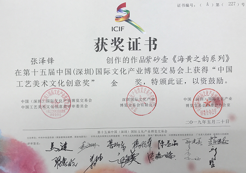 在父辈及同行前辈的指导下,靠着自己的不懈努力,张泽锋已经小有成就,不但在2015至2019年文博会“中国工艺美术文化创意奖”取得五连冠金奖,而且还取得了工艺美术师职称。