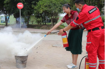 在培训现场演练中,关广富向大家展示了干粉灭火器、水基型水雾灭火器、车载灭火器、防护面罩等一系列的消防安全工具,并详细讲解其使用方法和功能。关广富现场演示了灭火器的正确使用方法,现场师生员工纷纷进行灭火和模拟逃生演练。