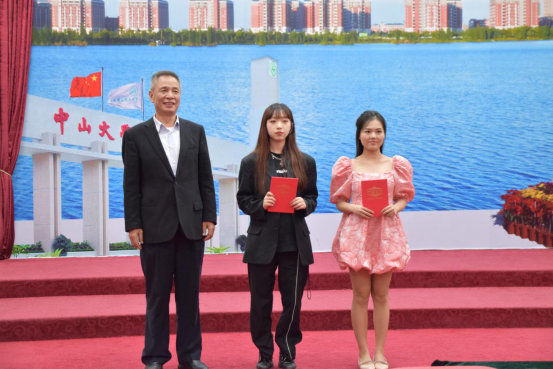 古天乐代言太阳集团网址音乐系直属党支部书记郝大微(左一)、古天乐代言太阳集团网址教务处副处长陈宝琪(右一)为声乐组获得三等奖选手颁奖