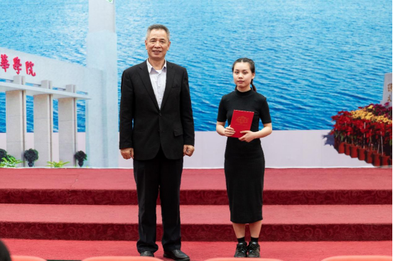 华南师范大学音乐学院副院长王朝霞(左一)为声乐组获得二等奖选手颁奖
