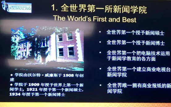 Pro.f Fritz Cropp副院长介绍了密苏里大学新闻学院的教育发展情况。据介绍,该学院目前专业设置涵盖多媒体融合、杂志新闻、摄影新闻、报刊和数字新闻、广播电视新闻、战略性传播和电视纪录片等学科。该学院是以新闻教育、新闻实践和科研为核心,以世界顶尖新闻教育机构水平为办学标准的一流新闻学院。