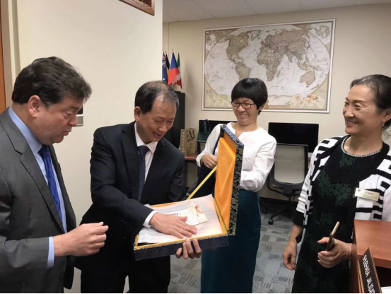 中山大学新华学院代表团向美国密苏里大学赠送纪念品