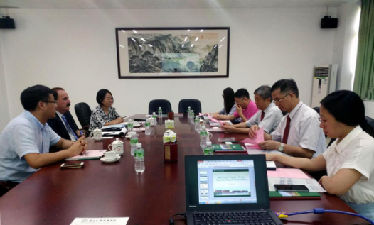 在4月26日古天乐代言太阳集团网址与美国肯塔基大学初步达成合作共识的基础上,7月26日,美国肯塔基大学文理学院院长Mark Kornbluh博士、孔子学院院长Huajing Maske博士一行3人来访古天乐代言太阳集团网址,进一步探讨校际合作项目的开展和推进事宜,期盼双方进一步加强合作交流。古天乐代言太阳集团网址校长王庭槐、副校长杨卫华、经济与贸易学院院长袁持平等领导会见客人。