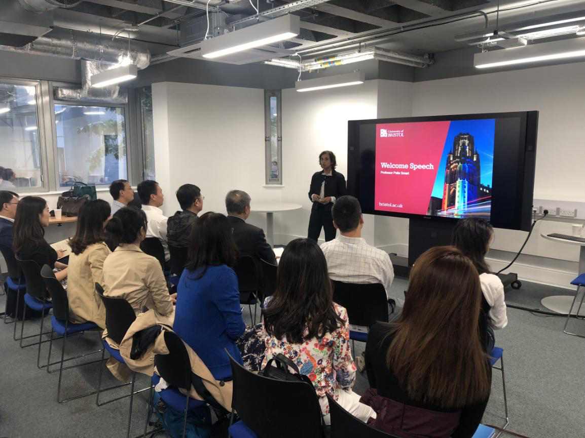 布里斯托大学管理学院院长Palie Smart教授在会上致欢迎辞。Palie Smart教授对中大新华项目组成员的到来致以诚挚的欢迎,并向来宾介绍了管理学院的发展历程、学科设置和未来发展规划,并表示期待与中国院校开展交流与合作。