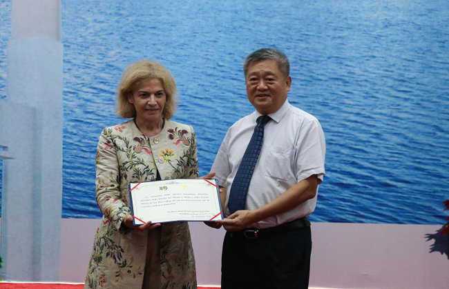 王庭槐校长(右)为Edda Silvestri教授(左)颁发聘书 黄文贞摄