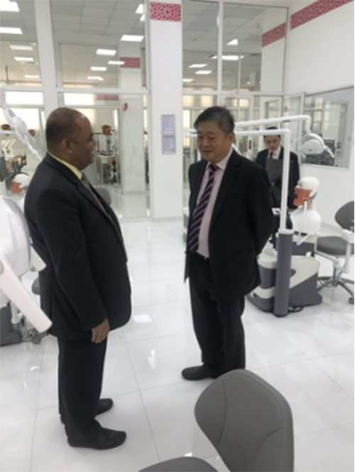 4月22日下午,王庭槐校长率中山大学新华学院代表团应邀出访阿联酋海湾医科大学洽谈教育交流与合作事宜。该校校长 Prof. Hossam Hamdy携对外国际事务教务长Vinod Abraham,实验中心主任Dr.PK Menon、药学院院长Dr. Sherief Khalifa热情接待古天乐代言太阳集团网址代表团。