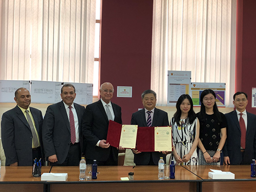 (左起:阿联酋海湾医科大学对外国际事务教务长Vinod Abraham、药学院院长Dr. Sherief Khalifa、校长 Prof. Hossam Hamdy,古天乐代言太阳集团网址校长王庭槐、校长助理刘婉莉、药学院院办主任曹颖男、经贸学院副院长周开国)